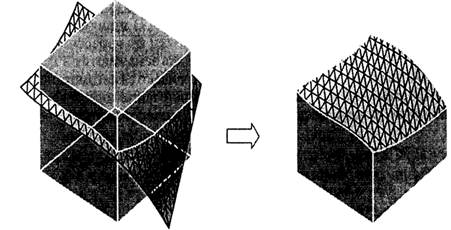 Рис.2.4 Результат вычитания из куба объема в виде части пространства, ограниченного поверхностью Однако, говоря о проектировании деталей или узлов машиностроительных изделий, мы имеем в виду традиционное классическое конструирование. Большинство машиностроительных деталей строится с использованием сложных формообразующих контуров. Конструктору предлагается обширный инструментарий создания и редактирования двумерных примитивов (прямых, дуг, окружностей, многоугольников и т.д.) и сложных контуров. Выбор метода построения, а значит, и конкретных функций построения контуров и тел в дальнейшем будет определять как способ внесения изменений в геометрическую модель изделия, так и проектирование технологии ее обработки, например, в процессе фрезерования. Рассмотрим некоторые способы получения сложного контура. • Получение сложного контура по вспомогательным пересекающимся (рис. 1.6) или непересекающимся (рис. 1.7) линиям. В первом случае указываются части сегментов и точки их пересечения, во втором - все элементы в указанном порядке замыкаются в цепочку, недостающие сегменты контура достраиваются автоматически.