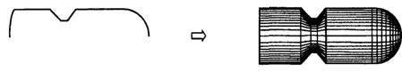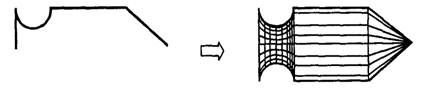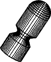 Рис.2.2. Кинематическое тело Рис.2.3. Тело вращения Кроме функций построения базовых тел в пакетах твердотельного моделирования реализованы различные функции создания тел сложной внешней формы. Это так называемые кинематические тела (рис. 2.2.) и тела вращения (рис. 2.3). В качестве формообразующих линий в таких телах сложной формы могут использоваться кривые, двумерные примитивы, сложные замкнутые или незамкнутые контуры. Есть возможность построить незамкнутую поверхность Безье и использовать ее в топологических операциях с телами. Чтобы не обременять конструктора сложным инструментом поверхностного моделирования, в математическом аппарате пакетов твердотельного моделирования реализованы некоторые упрощенные функции построения поверхностей по образующим линиям. Эти поверхности преобразуются в тела ограниченного объема и могут использоваться в топологических операциях с телами. Например, из любого твердого тела можно вычесть объем, ограниченный поверхностью (рис2.4). Осуществляется эта операция после преобразования поверхности в тело: часть полупространства, ограниченная поверхностью, указывается как объем, принадлежащий поверхности и участвующий в вычитании.