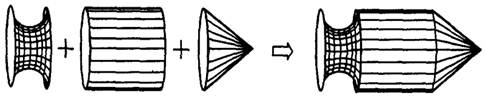 Рис. 1.13. Элементы (тело вращения, цилиндр и конус) и результат топологической операции сложения Все рассмотренные способы построения можно было бы считать равноценными, учитывая, что внешний вид (многогранное представление) результирующего тела всегда одинаковый. Однако отличия все-таки есть. Так, размер объекта в структуре данных в первом случае минимальный, поскольку содержит описание полигона формообразующей, в двух других случаях значительно больше, ибо содержит характеристики всех твердотельных конструктивных элементов и топологических операций. История создания твердого тела. Одной из важных характеристик твердого тела является история его создания. Содержательная часть истории создания включает описание всех элементов, используемых для построения тела, параметры и последовательность выполненных операций. История создания имеет иерархическую структуру. На нижнем уровне размещаются геометрические примитивы (плоские или объемные), параметры примитивов. На всех последующих уровнях могут размещаться сборки тел, полученные в результате преобразований над объектами нижнего уровня, а также промежуточные результаты топологических операций над отдельными конструктивными элементами. На верхнем уровне истории создания всегда находится результирующее тело (например, деталь) или сборка результирующих тел (например, узел или агрегат). История создания твердого тела содержит граничное представление всех конструктивных элементов, параметры и названия всех использованных объектов. Выделение самостоятельных геометрических моделей конструктивных элементов производится копированием прямо из истории создания. Это дает возможность быстрого доступа в любых моделях сложных тел, к любым промежуточным результатам и использования их при построении новых тел, а также позволяет организовать коллективный доступ к результатам работы многих конструкторов в едином проекте, не создавая дополнительных (резервных) копий всех конструктивных элементов. Кроме самой геометрии в истории создания хранится описание каждой операции в хронологическом порядке их выполнения, которые можно редактировать прямо в дереве истории создания. Пример схемы истории создания твердого тела приведен на рис. 1.14. На нижнем уровне - формообразующий контур тела вращения, из которого будут вычитаться «инструменты», а также два цилиндра, образующие впоследствии отверстия разного диаметра, и нужного размера параллелепипед, образующий на задней стенке детали полочку.