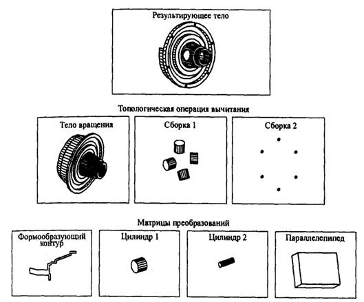 Рис. 1.14. Схема истории создания модели оси гироскопа На среднем уровне - тело вращения («заготовка» для вычитания) и две сборки цилиндров; первая сборка - массив из четырех копий цилиндров большего диаметра, расставленных вокруг оси вращения через 90°, вторая сборка - массив из шести цилиндров меньшего диаметра (поворот на 60°) (все «инструменты» должны располагаться относительно «заготовки» в нужном месте). На верхнем уровне - результат топологической операции вычитания. Модификация твердого тела. Модификация - это процедура преобразования исходной модели в новую модель изделия. Модификация модели зависит от способа ее построения и базируется на истории создания твердого тела. Редактирование модели сложного тела выполняется на любом этапе истории его создания. Так, на самом нижнем уровне можно редактировать параметры контуров, перестраивать их геометрию, а также изменять значения параметров твердотельных примитивов. На любом другом уровне конструктор может выполнять модификацию сложного тела путем манипуляций конструктивными элементами.