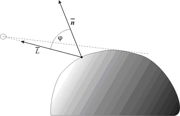 Свет точечного источника отражается от поверхности рассеивателя по закону Ламберта: интенсивность отражения пропорциональна косинусу угла между внешней нормалью к поверхности и направлением к источнику света (рис. 9.2). Если