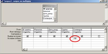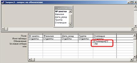 Используя запрос на обновление, пользователь может изменить группу записей, отобранную на основе определенных критериев. При разработке запроса на обновление прежде всего создается и проверяется запрос на выборку. После этого в режиме " Конструктора " активизируется команда " Обновление " из меню " Запрос ". В " бланке запроса " " Конструктора " появиться строка " Обновление ", которая предназначена для указания новых значений полей таблицы. В качестве таковых могут выступать и вычисляемые выражения. Рассмотрим процесс создания запроса на обновление на примере учебной базы данных " Успеваемость студентов ", решив задачу по увеличению стипендии в 2 раза всем студентам, у которых стипендия больше 50 рублей. Создадим запрос на выборку студентов, имеющих стипендию больше 50 рублей (Рис. 35). Выполнив запрос и убедившись в правильности отобранных записей, в режиме " Конструктора " выполним команду " Запрос "-" Обновление ". В " бланке запроса " появилась строка " Обновление " (Рис. 36), в которой и проставим условие обновления: [Стипендия]*2 Имя поля, которое используется в выражении, должно быть заключено в квадратные скобки (особенно это касается имен полей, обозначенных буквами русского алфавита).