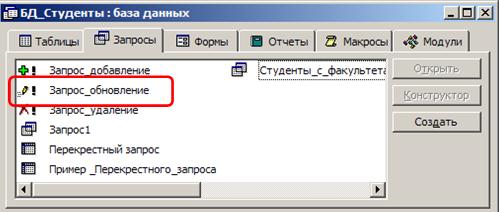 Сохраним запрос под именем " Запрос_обновление ". В окне базы данных во вкладке "Запросы" появится запрос с выбранным именем, соответствующей пиктограммой и восклицательным знаком (Рис. 39).