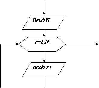 Элементы вводятся по порядку. В одном цикле вводится 1 элемент массива: сначала 1-ый, затем 2-ой ….N-ый. Т.е. цикл повторяеется N раз. Пусть i –порядковый номер массива. Тогда в i –м цикле вводится i –ый єлемент (рис. 3.33). Вывод массива происходит также поэлементно, анологично вводу - в цикле.