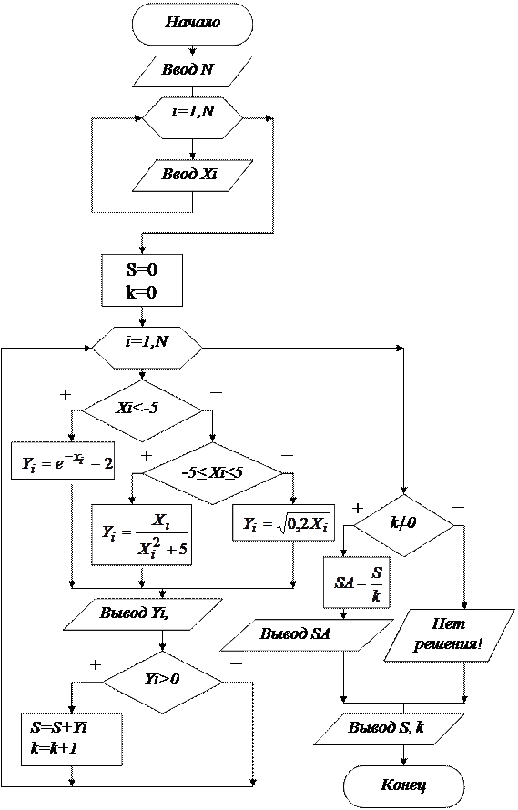 где Xi – i-ый элемент заданного массива X, а Yi – соответствующий элемент формируемого массива Y. Определить среденее арифметическое положительных элементов массива Y. Алгоритм приведен на рис. 3.34. Сначала вводится размерность массива и его элементы. Затем происходит очистка счетчиков. В следующем цикле происходит поєлементное формирование и взвод нового массива Y, а также накопление счетчиков S и k. После завершения цикла происходит анализ значения k: если оно отлично от 0, вычисляется Sr - среднее арифметическое положительных значений массива Y, а иначе выводится сообшение.