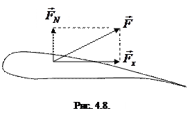 Аэродинамические силы – это силы, с которыми действует поток газа на тела. В этих условиях уравнение Бернулли надо применять с учетом возможной сжимаемости среды. Однако расчеты показывают, что вплоть до скоростей (500-600) Если аэродинамическая сила Рассмотрим действие аэродинамических сил на примере крыла самолета с профилем Жуковского, для которого характерно, что площадь верхней части крыла меньше площади нижней (см. рис. 4.8).