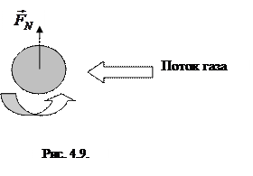 Действием аэродинамических сил объясняется эффект Магнуса. Этот эффект возникает при движении вращающегося тела в газе или жидкости. Рассмотрим вращающийся цилиндр, находящийся в потоке газа (см. рис. 4.9). При вращении тела, воздух вблизи его поверхности увлекается вращающейся поверхностью и возникающий поток складывается или вычитается из потока налетающего газа.