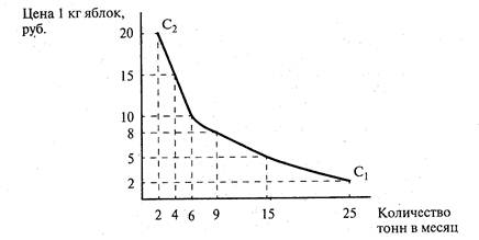 Шкала спроса показывает, сколько товаров можно купить по различным ценам за данный период. Анализ этой шкалы позволяет легче выявить зависимость спроса от цены. Закон спроса выражает следующую функциональную (математическую) зависимость спроса (С) от цены (Ц): С = Р(Ц), где F - показатель количественной зависимости. Чем выше цена товара, тем меньше спрос на него со стороны покупателей. Например, в нашей стране повышение цен на подписные издания в 1991-1998гг. привело к сокращению объема подписки. Действует и обратная зависимость: чем ниже цена, тем больше спрос. Такая количественная зависимость представлена в виде графика (рис. 6.2). Здесь взят тот же условный пример о продаже яблок на местном рынке. На оси ординат отложены цены на яблоки. На оси абсцисс указано количество яблок, на которое