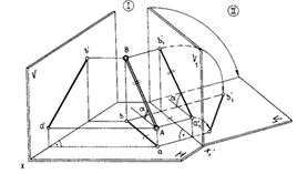 СПОСОБ ПЛОСКОПАРАЛЛЕЛЬНОГО ПЕРЕМЕЩЕНИЯ. СПОСОБЫ ПРЕОБРАЗОВАНИЯ ПРОЕКЦИЙ ОБЩИЕ ПОЛОЖЕНИЯ. СПОСОБ ЗАМЕНЫ ПЛОСКОСТЕЙ ПРОЕКЦИЙ. СПОСОБ ВРАЩЕНИЯ. Способы преобразования проекций предназначены главным образом для решения метрических задач, связанных с определением действительных размеров и формы изображенных на эпюре геометрических объектов. Две ортогональные проекции геометрического образа определяют его положение в пространстве. Однако произвольное положение такого геометрического образа относительно плоскости проекций не всегда удобно для решения ряда позиционных и метрических задач. Здесь происходит искажение в проекциях проецируемых форм, отсутствует необходимая наглядность как объекта в целом, так и отдельных его элементов. Во многих случаях решение задач значительно упрощается, если заданные геометрические элементы занимают в пространстве частное положение, поэтому в основе способов преобразования проекций – переход от общего положения к частному, когда величина и форма объекта проецируются без искажения. Различные требования к чертежу, а также необходимые условия для упрощения решения ряда позиционных и метрических задач требуют построения новых, дополнительных проекций, исходя из двух заданных. Дополнительные проекции позволяют получить либо выраженные проекции отдельных элементов, либо их натуральные величины. Построение новых, дополнительных проекций называют преобразованием чертежа или проекций. Такое преобразование может быть выполнено следующими способами: заменой плоскостей проекций (рис. 39 – 41), вращением (рис.42 – 44), совмещением (рис. 45), плоскопараллельным перемещением (рис. 46). Новые проекции точек и осей проекций обозначают теми же буквами, но с цифровым индексом внизу, который определяет последовательность преобразований. Способ замены плоскостей проекций. Сущность способа замены плоскостей проекций заключается в том, что при неизменном положении объекта в пространстве производится замена данной системы плоскостей проекцией новой системой взаимно перпендикулярных плоскостей проекций (рис. 39а). При переходе к новой системе одну из плоскостей проекций заменяют новой плоскостью таким образом, чтобы данный геометрический элемент (прямая, плоскость) занял частное положение и проецировался без искажения. При решении ряда метрических задач требуется преобразовать прямую общего положения в прямую уровня, а затем — в проецирующую, выполнив при этом последовательно два преобразования. Рассмотрим ход решения этой задачи. Первое преобразование (рис. 39б). Для того чтобы прямая АВ спроецировалась линией уровня, следует ввести новую плоскость проекций и расположить ее параллельно данной прямой. При этом новая ось х1 будет параллельна одной из проекций прямой. На рис. 39 а, б ось проведена параллельно горизонтальной проекции ab, а новая плоскость проекций Vl расположена параллельно прямой АВ, которая проецируется на эту плоскость в истинную величину (новая фронтальная проекция прямой — а1'b'1). Новая ось х1 и плоскость проекции V1 могут быть расположены на любом расстоянии от прямой, они могут совпадать с прямой и ее проекцией.