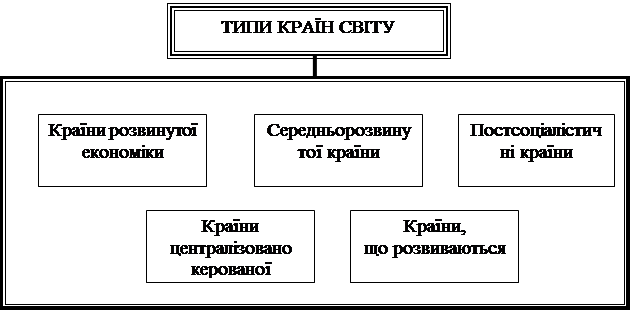 Загальновизнаними для визначення рівня економічного розвитку країни є валовий національний продукт або валовий внутрішній продукт. За цими критеріями виділяють 5 типів країн: 1. Економічно високо розвинуті країни, з ВВП понад 30 тис дол. (США, Японія, Швейцарія, Норвегія, Данія, Сінгапур, Малайзія). 2. Країни з середнім рівнем розвитку (10 – 30 тис. дол.) – Канада, ФРН, Франція, Великобританія, Ісландія, Італія, Греція, Нідерланди, Бельгія, Швеція, Австрія Ліхтенштейн, Люксембург, Монако, Португалія, Іспанія, Фінляндія, Республіка Корея, Австралія, Нова Зеландія. 3. Країни з ВВП від 3 до 10 тис. дол. (Саудівська Аравія, Іран, Туреччина, Ізраїль, ПАР, Польща, Чехія, Словаччина, Угорщина, Словенія, Хорватія, Індонезія, Мексика, Бразилія, Венесуела, Чилі, Аргентина). 4. Країни з ВВП від 1 до 3 тис. дол. (Росія, Білорусь, Україна, Естонія, Латвія, Литва, Боснія і Герцеговина, Сербія і Чорногорія, Македонія, Румунія, Болгарія, Казахстан, Єгипет, Лівія, Алжир, Марокко, Куба, Перу, Сурінам, Колумбія, Еквадор, Болівія, Парагвай, Лаос) 5. Країни з ВВП менш ніж 1 тис. дол. (КНР, МНР, Північна Корея, В’єтнам, Індія, Афганістан, Пакистан, Таїланд, Камбоджа, країни Центральної Африки, Гайана, Гватемала, Сальвадор, Албанія, Ірак, Ємен). Структуру господарства країни визначають або за галузевою структурою зайнятості або за галузевою структурою ВВП. Згідно цього виділяють: аграрні, індустріальні, постіндустріальні, аграрно-індустріальні (індустріально-аграрні) країни. Для визначення типу країн враховують також рівень сформованості організаційно-управлінських структур, функціонально-галузевих і територіально-господарських структур. Виходячи з цих критеріїв, також виділяють 5 типів країн: 1. Країни розвинутої економіки (країни “великої сімки”, промислово розвинуті країни Західної Європи, промислово розвинуті країни Південної півкулі). Основні закономірність цих країн – наявність високо розвинутого господарства, в якому поєднується діяльність держави і потужних угруповань капіталу. На них припадає майже половина ВВП та виробництва промислової продукції світу, більша частина оборотів світової зовнішньої торгівлі. США, Японія, ФРН, Франція, Великобританія, Італія, Канада; Нідерланди, Бельгія, Швеція, Швейцарія, Фінляндія, Норвегія, Данія, Австрія та ін.; Австралія, Нова Зеландія, ПАР. 2. Середньо розвинуті країни перехідної економіки – індустріальні та індустріально-аграрні країни, у яких сформувався сучасний механізм ринкової економіки, але їх господарство має економічні показники менші, ніж економічно розвинуті країни і в них не до кінця сформовані господарські структури. Їх поділяють на 2 підгрупи країн: 2а. Країни, що із запізненням стали на шлях капіталістичного розвитку (Іспанія, Португалія, Туреччина, Греція тощо). 2б. Країни нової індустріалізації (Республіка Корея, Тайвань, Сінгапур та ін., Мексика, Аргентина, Уругвай, Бразилія, Чилі). 3. Постсоціалістичні країни перехідної економіки: 3а. Постсоціалістичні крани Євраз ії (Польща, Чехія, Словаччина, Угорщина, Монголія та ін.). 3б. Молоді незалежні держави (країни, які входили до складу СРСР). 4. Країни, що розвиваються (120 країн Азії, Африки, Латинської Америки та Океанії): 4а. Індустріально-аграрні країни з порівняно зрілою структурою господарства (Індія, Пакистан, Таїланд, Філіппіни, Індонезія, Венесуела, Перу, Колумбія, Еквадо