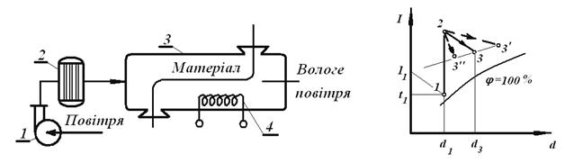 3. Схема конвективного сушіння. Процес в I-d діаграмі.