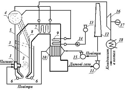 Схема котельної установки: 1 – пальник: 2 – топка; 3 – екранні труби; 4 – барабан котла; 5 – опускні труби; 6 – нижні колектора; 7 – пароперегрівник; 8 – фестон; 9 – економайзер; 10 – повітропідігрівник; 11 – димосос; 12 – димова труба; 13 – деаератор; 14 – живильні насоси; 15 – вентилятор; 16 – парова турбіна; 17 – електрогенератор; 18 – конденсатор.