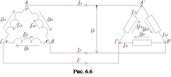 Якщо в незв’язаному трифазному колі з’єднати точки A і z, B і x, C і y фаз генератора, а фази приймача з’єднати в замкнутий контур, то одержимо трипроводове трифазне коло, з’єднане трикутником (рис.6.6). Умовне При симетричній системі фазних ЕРС і правильному їх з’єднанні завжди виконується умова: E AB+ E BC+ E CA=0. Якщо з’єднати обмотки генератора трикутником при несиметричній системі трифазних ЕРС то може статися коротке замикання. При з’єднанні трикутником мають місце фазні і лінійні напруги та струми: E AB, E BC, E CA – фазні ЕРС генератора Е ф; I A; I B; I C.– лінійні струми ІЛ, які протікають в лінійних проводах; I AB; I BC; I CA – фазні струми Іф, які протікають в фазах генератора та приймача; U AB, U BC, U CA – фазні напруги генератора U ф; U A'B'; U B'C'; U C'A' - фазні напруги приймача U' ф. Позитивний напрям фазних ЕРС приймаємо від кінця обмотки до початку, напруги – від початку до кінця, а позитивний напрям струму співпадає з позитивним напрямом напруги. Із електричної схеми видно, що при з’єднанні трифазного кола трикутником U ф = U Л.