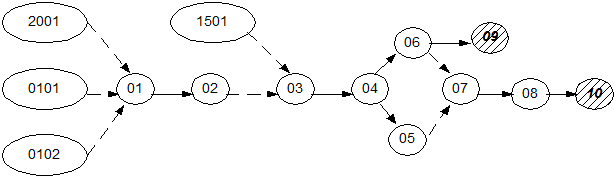 Рисунок 4.12. Локальная сетевая модель Земстроя. /В схеме заштрихованные круги обозначают сдачу работ/. Рисуем узел 2001 и проводим пунктирную стрелку к узлу 01. Даем формулировку событию 2001. 2001 (20 – код Генподрядчика, 01 – номер его узла). 01 – ПСД в производство выдана Снова ставим вопрос? Что еще необходимо для свершения события 01? 0101 – объект на местности привязан (01 – код Заказчика, 01 – номер его узла). 0102 – существующие здания и сооружения снесены; В данном случае указали все условия для начала работы, т.е. для свершения события 01. Далее указываем свои работы и события. 02 – разбивка здания выполнена; После 02 мы можем приступить к механизированной разработке грунта на захватке №1. Ставим вопрос: что нужно для начала механизированной разработки грунта на захватке №1? Ответ: 02 и временные дороги. Организуем событие 1501 и связываем его с событием 03. 03 – механизированная разработка грунта начата на I захватке; 1501 – временные дороги сданы в эксплуатацию (15 – код Дорстроя, 01 – номер его узла); 04 – механизированная разработка грунта на I захватке окончена; После события 04 ставим вопрос: какие работы мы можем начинать? Ответ: Механизированную разработку грунта на захватке №2 и подчистку основания на захватке №1. Соответствующим образом показываем. 05 – механизированная разработка грунта на II захватке окончена; 06 – подчистка основания I захватки окончена; 07 – подчистка основания II захватки начата; 08 – подчистка основания II захватки окончена; 09 – основание I захватки сдано; 10 – основание II захватки сдано. События сдачи мы выделяем. Локальные модели исполнителей должны учитывать скорейшее представление фронта работ последующим исполнителем.