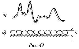 где l - безразмерный коэффициент сопротивления трения; l – длина участка трубы; d – диаметр трубы. Коэффициент сопротивления в общем случае зависит от числа Рейнольдса и шероховатости трубы. Под технической шероховатостью понимаются неровности стенок трубы, распределение которых носит случайный характер, как это показано в большом масштабе на рис.43,а. Среднюю величину такой шероховатости определить практически невозможно, поэтому для характеристики натурной технической шероховатости вводится понятие эквивалентной зернистой шероховатости, образованной искусственными зернами (чаще всего это калиброванный песок) высотой k (рис.43,б). При этом эквивалентной называется такая зернистая (искусственная) шероховатость высотой k, при которой потери на трение равны соответствующим потерям при течении в рассматриваемой трубе с технической шероховатостью. Тогда считают, что величина данной технической шероховатости равна k.