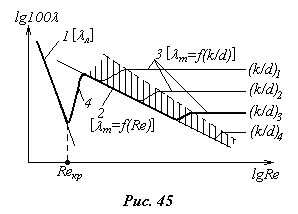 4). Возможен переходный режим течения между вторым и третьим вариантами, когда толщина ламинарного подслоя и высота бугорков – величины одного порядка, т. е. dл@k (рис.44,в). Тогда коэффициент сопротивления зависит одновременно от обоих факторов lт=f (Re, k/d):