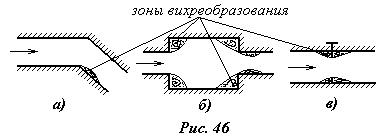 На рис.45 представлена зависимость l=f (Re,k/d). Линия 1 соответствует ламинарному движению lл=f (Re), линия 2 – турбулентному движению в случае гидравлически гладкой трубы lт=f (Re). Переход с кривой 1 на кривую 2 начинается при числе Рейнольдса, равном критическому Reкр (кривая 4). Линии 3 характеризуют коэффициент сопротивления в зависимости от относительной шероховатости lт=f (k/d). При этом, очевидно, что (k/d) 1 >(k/d) 2 >(k/d) 3 >(k/d) 4. В начале отхода от линии 2 все линии 3 на идут параллельно оси lgRe, т. е. в этой зоне, которая называется переходной (заштрихована), lт=f (Re,k/d). За переходной зоной все линии 3 параллельны оси lgRe и здесь lт=f (k/d). На рис.45 жирной линией показано изменение l в зависимости от Re для трубы с относительной шероховатостью (k/d) 3. б) Потери напора на местные сопротивления или местные потери напора возникают в тех местах, где поток меняет свою конфигурацию или направление (участки с неплавно изменяющимся характером движения). К местным сопротивлениям относятся колена (рис.46,а), внезапное сужение или расширение потока (рис.46,б), различные краны, задвижки, фильтры, решетки (рис.46,в), и т. д. В этих случаях в потоке возникают вихри, которые главным образом и обусловливают потери энергии потока в местных сопротивлениях. Расчет местных потерь ведется по формуле