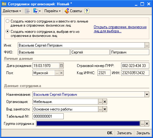 Рис. 8.2. Заполнение информации о сотруднике организации