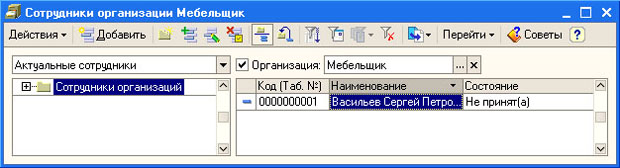 Как видите, в форму информации о сотруднике были скопированы сведения из формы данных о физическом лице. Можно заметить, что элемент справочника Сотрудники организаций содержит меньше сведений, чем элемент справочника Физические лица. Например, здесь нет информации об НДФЛ, об адресе сотрудника и т.д. Так же обратите внимание на то, каким образом можно создавать элементы этого справочника. Если ранее вы ввели данные о физическом лице их можно перенести в справочник Сотрудники организаций, выбрав параметр Создать нового сотрудника, выбрав его из справочника физических лиц и нажав на соответствующую кнопку. Если же вы не вводили ранее данных о нужном вам физическом лице, вы должны будете оставить установленным параметр Создать нового сотрудника и ввести его личные данные в справочник физических лиц - вам придется заполнить элемент справочника Сотрудники организаций, данные из которого будут перенесены так же в справочник Физические лица, а в последнем справочнике вам может понадобиться дополнение данных. Автоматическое заполнение элемента справочника Сотрудники организаций нас устраивает, поэтому нажимаем ОК. Вот как выглядит форма списка этого справочника (рис. 8.3).