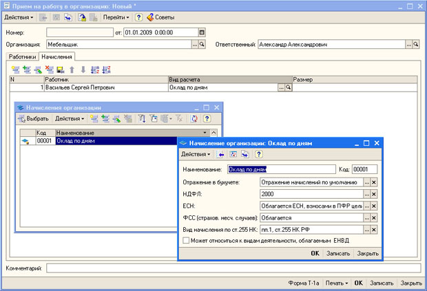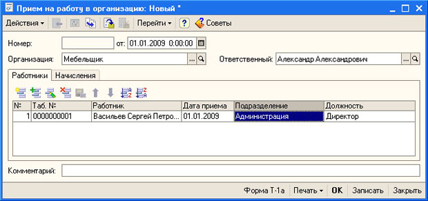 Документ оформляется для одной из организаций, учет по которым ведется в базе (реквизит Организация), он имеет две вкладки. Вкладка Работники содержит список работников (из справочника Сотрудники организаций), прием которых на работу мы собираемся зарегистрировать с помощью документа. Здесь есть табличное поле, в котором указывается табельный номер сотрудника, его ФИО, дата приема, подразделение, в которое он принимается и должность. Установим дату приема работника 01.01.2009, подразделение - Администрация, должность - Директор. Ранее мы вводили данные для полей Подразделение и Должность, поэтому сейчас нам лишь нужно выбрать их из соответствующих списков. В табличном поле вкладки Работники может содержаться информация о нескольких работниках, но мы в данном примере ограничимся одним. Теперь рассмотрим вкладку Начисления (рис. 8.5).