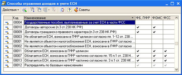 Единый социальный налог имеет сложную структуру, не все выплаты сотрудникам организации подлежат обложению ЕСН, в справочнике приведены различные варианты обложения доходов ЕСН, в нашем случае подходит элемент, выбранный по умолчанию - Облагается целиком.