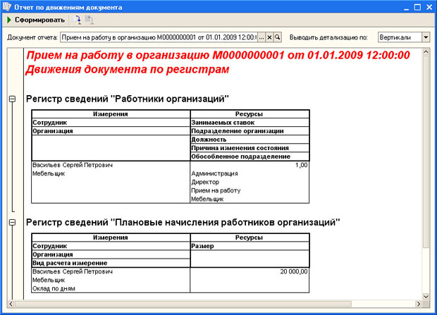 Выполнив все вышеперечисленные действия, сохранив и проведя документ, мы можем при необходимости распечатать форму приказа и посмотреть движения документа по регистрам (Перейти > Движения документа по регистрам). При проведении документ формирует движения по регистру сведений Работники организаций, в который вносится информация о работнике, а так же по регистру сведений Плановые начисления работников организаций (рис. 8.8).
