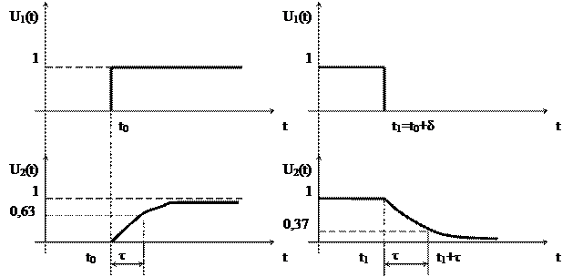 Рис. 4. Переходный процесс в апериодическом звене при включении и выключении сигнала на выходе