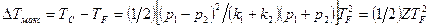 Пусть показанное на рисунке направление тока I относительно спая С положительно, разность р1 – p2 тоже положительна; тогда на этом спае выделяется тепло (Q > О). В тех же условиях на спае F направление тока I обратное, разность р1 – p2 отрицательна и тепло поглощается (Q < О). Следовательно, температура спая С возрастает, в то время как температура спая F понижается. Количество тепла, выделяемое спаем F, переносится к спаю С. Положение меняется на обратное, если изменить направление тока (I < О). Следовательно, просто изменением направления тока можно нагревать или охлаждать спай (другой спай будет соответственно охлаждаться или нагреваться). Поведение системы, однако, ограничено условиями теплового равновесия, которое определяется эффектом Пельтье (p1 и p2), теплопроводностью материалов (k1 и k2) и рассеянием мощности в проводниках в соответствии с эффектом Джоуля, пропорциональным удельному сопротивлению металлов p1 и p2. Максимальный перепад температур между двумя спаями определяется тогда по формуле: