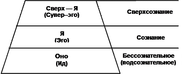 Рис. 11. Структура личности по Фрейду Поведенческая концепция личности возникла и развивалась в рамках психологии бихевиоризма. С этой точки зрения поведение личности складывается из трех типов поведения: безусловно-рефлекторное поведение, которое определяется системой безусловных рефлексов и мало осознается личностью; условно-рефлекторное поведение, которое определяется системой условных рефлексов, сформированных в процессе жизни индивида и заключающих в себе его жизненный опыт (поэтому такое поведение может быть достаточно разнообразным в зависимости от условий жизни, и оно также может быть малоосознаваемым); оперантное поведение, которое представляет собой стихийно выбранные формы поведения, закрепленные в привычках и стереотипах. Оперантное поведение в значительной мере индивидуально и, как привило, имеет определенное рациональное обоснование.