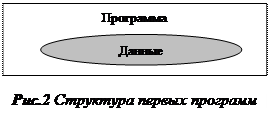 Цели занятия: Обучающая: получить представление об этапах развития технологий программирования и их особенностях; Ведущий метод обучения: объяснительно-иллюстративный. Форма занятия: лекция. Оснащение урока: конспект лекции, презентации. Чтобы разобраться в существующих технологиях программирования и определить основные тенденции их развития, целесообразно рассматривать эти технологии в историческом контексте, выделяя основные этапы развития программирования как науки. Первый этап - «стихийное» программирование. Этот этап охватывает период от момента появления первых вычислительных машин до середины 60-х годов XX в. В этот период практически отсутствовали сформулированные технологии и программирование фактически было искусством. Первые программы имели простейшую структуру. Они состояли из собственно программы на машинном языке и обрабатываемых ею данных (Рис.2). Сложность программ в машинных кодах ограничивалась способностью программиста одновременно мысленно отслеживать последовательность выполняемых операций и местонахождение данных при программировании.