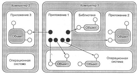 Рис.7 Взаимодействие программных компонентов различных типов Каждый интерфейс имеет имя, начинающееся с символа «I», и глобальный уникальный идентификатор IID (Interface IDentifier). Любой объект СОМ обязательно реализует интерфейс IUnknown (на схемах этот интерфейс всегда располагают сверху). Использование этого интерфейса позволяет получить доступ к остальным интерфейсам объекта. Объект всегда функционирует в составе сервера - динамической библиотеки или исполняемого файла, которые обеспечивают функционирование объекта. Различают три типа серверов: 1. Внутренний сервер; реализуется динамическими библиотеками, которые подключаются к приложению-клиенту и работают в одном с ними адресном пространстве, наиболее эффективный сервер, кроме того, он не требует специальных средств; 2. Локальный сервер; создается отдельным процессом (модулем, ехе), который работает на одном компьютере с клиентом; 3. Удаленный сервер; создается процессом, который работает на другом компьютере. Например, Microsoft Word является локальным сервером. Он включает множество объектов, которые могут использоваться другими приложениями. Для обращения к службам клиент должен получить указатель на соответствующий интерфейс. Перед первым обращением к объекту клиент посылает запрос к библиотеке СОМ, хранящей информацию обо всех зарегистрированных в системе классах СОМ объектов, и передает ей имя класса, идентификатор интерфейса и тип сервера. Библиотека запускает необходимый сервер, создает требуемые объекты и возвращает указатели на объекты и интерфейсы. Получив указатели, клиент может вызывать необходимые функции объекта. Взаимодействие клиента и сервера обеспечивается базовыми механизмами СОМ или DCOM, поэтому клиенту безразлично местонахождение объекта. При использовании локальных и удаленных серверов в адресном пространстве клиента создается proxy-объект - заместитель объекта СОМ, а в адресном пространстве сервера СОМ - заглушка, соответствующая клиенту. Получив задание от клиента, заместитель упаковывает его параметры и, используя службы операционной системы, передает вызов заглушке. Заглушка распаковывает задание и передает его объекту СОМ. Результат возвращается клиенту в обратном порядке. На базе технологии СОМ и ее распределенной версии DCOM были разработаны компонентные технологии, решающие различные задачи разработки программного обеспечения. OLE-automation или просто Automation (автоматизация) - технология создания программируемых приложений, обеспечивающая программируемый доступ к внутренним службам этих приложений. Вводит понятие диспинтерфейса (dispinterface) - специального интерфейса, облегчающего вызов функций объекта. Эту технологию поддерживает, например, Microsoft Excel, предоставляя другим приложениям свои службы. ActiveX - технология, построенная на базе OLE-automation, предназначена для создания программного обеспечения как сосредоточенного на одном компьютере, так и распределенного в сети. Предполагает использование визуального программирования для создания компонентов - элементов управления ActiveX. Полученные таким образом элементы управления можно устанавливать на компьютер дистанционно с удаленного сервера, причем устанавливаемый код зависит от используемой операционной системы. Это позволяет применять элементы управления ActiveX в клиентских частях приложений 