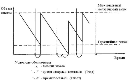 Гарантийный (страховой) запас позволяет обеспечивать потребность на время предполагаемой задержки поставки (под возможной задержкой поставки также подразумевается максимально возможная задержка). Графическая иллюстрация функционирования системы управления запасами с фиксированным интервалом времени между заказами представлена на рис.5.6.