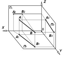Рис. 3.4. Из рис. 3.2, 3.3, 3.4 видно, что характерным признаком прямой уровня является то, что одна из проекций прямой проходит под углом, не равным 900 и 1800 к одной из осей проекций, а две другие параллельны или перпендикулярны соответствующим осям. На рис. 3.5 показана модель и комплексный чертеж горизонтально-проецирующей прямой АВ. Горизонтальная проекция этой прямой вырождается в точку, а фронтальная А2В2 и профильная А3В3 проекции перпендикулярны, соответственно осям ОХ и ОУ. Горизонтально проецирующая прямая параллельна одновременно плоскостям проекций П2 и П3, следовательно, на эти плоскости она проецируется в натуральную величину, т.е. |А2В2| = |А3В3| = |АВ|