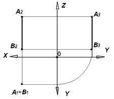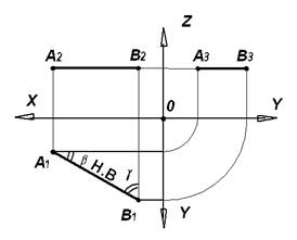Рис. 3.3. На рис. 3.4 показана модель и комплексный чертеж прямой АВ профильного уровня. Ее профильная проекция занимает положение, соответствующее положению самой прямой в пространстве, а горизонтальная А1В1 и фронтальная А2В2 проекции перпендикулярны оси ОХ, так как XВ - ХА = 0. Отрезок [ АВ ] прямой профильного уровня и углы α и β