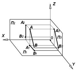 Рис. 3.5. На рис. 3.6. показана модель и комплексный чертеж фронтально-проецирующей прямой АВ. Фронтальная проекция этой прямой вырождается в точку, а горизонтальная А1В1 и профильная А3В3 проекции перпендикулярны соответственно осям ОХ и ОZ. Фронтально проецирующая прямая параллельна одновременно плоскостям проекций П1 и П3, следовательно, на эти плоскости она проецируется в натуральную величину, т.е. |А1В1| = |А3В3| = |АВ| На рис. 3.7 показана модель и комплексный чертеж профильно- проецирующей прямой АВ. Профильная проекция этой прямой вырождается в точку, а горизонтальная А1В1 и фронтальная А2В2 проекции перпендикулярны соответственно осям ОУ и ОZ. Профильно-проецирующая прямая параллельна одновременно плоскостям проекций П1 и П2, следовательно, на эти плоскости она проецируется в натуральную величину, т.е. А1В1| = |А2В2| = |АВ|
