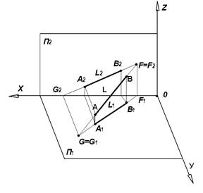 Точки пересечения (встречи) прямой ℓ c плоскостями проекций П1, П2 или П3 называются соответственно горизонтальным, фронтальным или профильным следом прямой. На рис. 3.8 точка F - фронтальный след прямой АВ; точка G - горизонтальный след прямой АВ. Фронтальная проекция фронтального следа F2 и горизонтальная проекция горизонтального следа G1 всегда совпадают с самими следами, в какой бы четверти пространства не находилась прямая. Пользуясь нижеприведенным правилом, построим проекции и следы прямой на комплексном чертеже (рис. 3.9).
