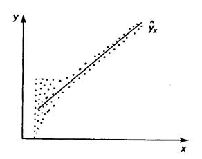 Рис. 2.2. Зависимость случайных остатков В этих случаях необходимо либо применять другую функцию, либо вводить дополнительную информацию и заново строить уравнение регрессии до тех пор, пока остатки Вторая предпосылка МНК относительно нулевой средней величины остатков означает, что Вместе с тем, несмещенность оценок коэффициентов регрессии, полученных МНК, зависит от независимости случайных остатков и величин