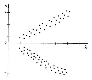 Рис. 2.4. Примеры гетероскедастичности. Наличие гомоскедастичности или гетероскедастичности можно видеть и по рассмотренному выше графику зависимости остатков