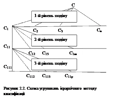 Система класифікації визначається і характеризується використаним методом класифікації, ознаками, їх послідовністю і кількістю ступенів класифікації, а також кількістю угруповань (ємністю). Метод класифікації - це сукупність правил створення системи класифікаційних угруповань і їх зв'язки між собою. Ознака класифікації - це властивість об'єкта класифікованої множини, які можуть мати кількісне або якісне значення. Кількість значень ознаки класифікації визначає кількість класифікаційних угруповань, які можуть бути створені при розподілі множини об'єктів за цією ознакою. Розрізняють два основні методи класифікації: 1) ієрархічний; 2) фасетний. Ієрархічний метод класифікації характеризується тим, що початкова множина об'єктів техніко-економічної інформації послідовно поділяється на угруповання (класи) першого рівня поділу, далі - на угруповання наступного рівня і т.ін. Сукупність угруповань утворює при цьому ієрархічну деревоподібну структуру, яку часто зображують у вигляді гіллястого графа, вузлами якого є угруповання (рисунок 2.2).