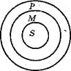 Рис. 15 Відношення між термінами S—М—Р категоричного силогізму прийнято відтворювати за допомогою кіл як відношення між обсягами понять, що входять до засновку. Відношення обсягів понять буде таким: якщо обсяг поняття М входить до обсягу поняття Р, а обсяг поняття S входить до обсягу поняття М, то обсяг поняття S входить до обсягу поняття Р (рис. 15). Відповідно, коли відомо, що клас предметів М не містить ознак Р, то й усякий окремий предмет S, що входить до класу М, не має ознак Р. Наприклад: Жодна чесна людина (М) не обманює (Р). Петров (S) – чесна людина (М) Отже, Петров (S) не обманює (Р).