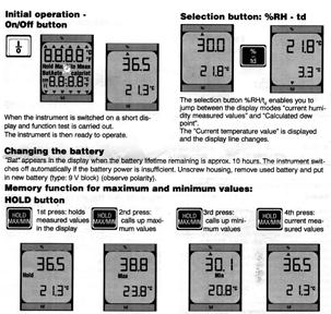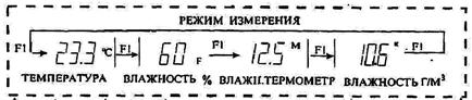 В качестве чувствительного элемента измерителя температуры используется пленочный терморезистор, выполненный из никеля. Чувствительным элементом измерителя относительной влажности является емкостной датчик с изменяющейся диэлектрической проницаемостью. Принцип работы прибора основан на преобразовании емкости датчика влажности и сопротивления датчика температуры в частоту с дальнейшей обработкой ее с помощью микроконтроллера. Микроконтроллер обрабатывает информацию, отображает ее на жидкокристалическом индикаторе и одновременно выдает с помощью интерфейса RS – 232 на компьютер. Прибор включается однократным нажатием кнопки F1 - на индикаторе появляются либо значение измеряемой температуры в °С, либо измеряемой относительной влажности в %. Повторное нажатие кнопки F1 - приводит к последовательному изменению выводимых на индикатор величин: температура, относительная влажность, температура влажного термометра, влажность в г/м3, снова температура (Рис.) и т.д. Температура "влажного термометра", необходимая для вычислении температурного индекса WBGT. (Если случайно Вы нажали кнопку F2, то, чтобы перейти в режим измерения, надо нажать кнопку F1. Если вы случайно попали в неизвестный режим, выключите прибор кнопкой ВЫКЛ а, затем включите его кнопкой F1).