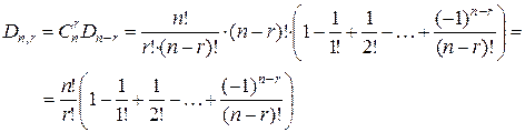 Обозначим через Dn,r число перестановок, в которых на своих местах остаются r элементов, а остальные (n-r) образуют беспорядок. Ясно, что Dn,n =1 (все элементы на своих местах), и Dn,0=Dn (ни одного элемента нет на своём месте). Теорема. # r элементов, стоящих на своём месте, можно выбрать из n элементов С другой стороны, (n-r) элементов, образующих беспорядки, можно выбрать