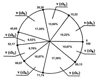 Рассмотрим сильно упрощенный и довольно искусственный пример, состоящий в нахождении хромосомы с максимальным количеством единиц. Допустим, что хромосомы состоят из 12 генов, а популяция насчитывает 8 хромосом. Понятно, что наилучшей будет хромосома, состоящая из 12 единиц. Посмотрим, как протекает процесс решения этой весьма тривиальной задачи с помощью генетического алгоритма. Инициализация, или выбор исходной популяции хромосом. Необходимо случайным образом сгенерировать 8 двоичных последовательностей длиной 12 битов. Это можно достигнуть, например, подбрасыванием монеты (96 раз, при выпадении «орла» приписывается значение 1, а в случае «решки» – 0). Таким образом, можно сформировать исходную популяцию сh1 = [111001100101] ch5 = [010001100100] ch2 = [001100111010] ch6 = [010011000101] ch3 = [011101110011] ch7 = [101011011011] ch4 = [001000101000] ch8 = [000010111100] Оценка приспособленности хромосом в популяции. В рассматриваемом упрощенном примере решается задача нахождения такой хромосомы, которая содержит наибольшее количество единиц. Поэтому функция приспособленности определяет количество единиц в хромосоме. Обозначим функцию приспособленности символом F. Тогда ее значения для каждой хромосомы из исходной популяции будут такие: F (ch1) = 7 F (ch5) = 4 F (ch2) = 6 F (ch6) = 5 F (ch3) = 8 F (ch7) = 8 F (ch4) = 3 F (ch8) = 5 Хромосомы ch3 и ch7 характеризуются наибольшими значениями функции принадлежности. В этой популяции они считаются наилучшими кандидатами на решение задачи. Если в соответствии с блок-схемой генетического алгоритма (рис.9.1) условие остановки алгоритма не выполняется, то на следующем шаге производится селекция хромосом из текущей популяции. Селекция хромосом. Селекция производится методом рулетки. На основании формул (9.2) и (9.3) для каждой из 8 хромосом текущей популяции (в нашем случае – исходной популяции, для N = 8) получаем секторы колеса рулетки, выраженные в процентах (рис.9.2). v (ch1) = 15,22 v (ch5) = 8,70 v (ch2) = 13,04 v (ch6) = 10,87 v (cn3) = 17,39 v (ch7) = 17,39 v (ch4) = 6,52 v (ch8) = 10,87