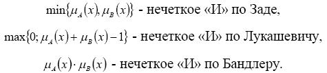 Введенные выше операции над нечеткими множествами основаны на использовании операций max и min. В теории нечетких множеств разрабатываются вопросы построения обобщенных, параметризованных операторов пересечения, объединения и дополнения, позволяющих учесть разнообразные смысловые оттенки соответствующих им лингвистических связок естественного языка «и», «или», «не». Один из подходов к операторам пересечения и объединения заключается в их определении при помощи нечетких операторов, т.н. треугольных норм и конорм. Следует обратить внимание на то, что представленные выше варианты вычисления нечеткого «И» как min Треугольной нормой ( t -нормой) называется двуместная действительная функция T, отображающая две функции принадлежности нормальных нечетких множеств