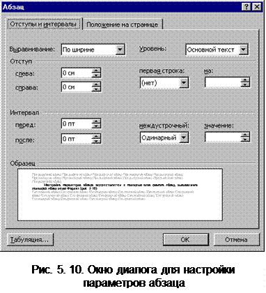 Первая строка может иметь три значения: без выступа, выступ вправо – красная строка или выступ влево – висячая строка (рис. 5.6). Интервал между абзацами и междустрочный интервал измеряются в пунктах. Закладка “Положение на странице” определяет возможность использования висячей строки, взаимодействие абзацев, возможность разрыва абзаца при переносе на следующую страницу, перенос слов, нумерацию строк. Настройка параметров абзаца осуществляется с помощью окна диалога Абзац, вызываемого командой Абзац меню Формат (рис. 5.10). Часть параметров можно регулировать с помощью горизонтальной линейки (рис. 5.11).