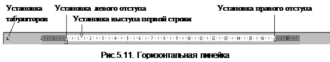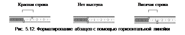 На горизонтальной линейке имеется три маркера: два в левой части и один в правой части линейки. Эти маркеры позволяют устанавливать отступы и выступ первой строки. Если маркеры “Установка левого отступа” и “Установка выступа первой строки” совмещены, то выступ у первой строки отсутствует, если маркер “Установка выступа первой строки” находится справа от маркера “Установка левого отступа”, то формируется красная строка, а если маркер “Установка выступа первой строки” находится слева от маркера “Установка левого отступа”, то формируется висячая строка (рис. 5.12).