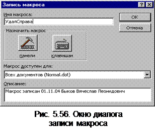 Запись макроса средствами записи программы Word Макрокоманды Макрокоманды или иначе Макросы позволяют легко и эффективно описывать часто повторяющиеся действия и тем самым повышать производительность туда пользователя. Макрокоманды хранятся в шаблонах. Выбором шаблона для сохранения ограничивается круг документов, в которых можно использовать ту или иную макрокоманду. Место хранения макроса указывается при его создании. Макрокоманду можно также скопировать из одного шаблона в другой, используя команду Организатор из меню Формат, Стиль. Макрокоманда может быть написана пользователем с использованием встроенного языка программирования Visual Basic или записана с помощью средств записи программы Word. Макрокоманда имеет имя. Имя макрокоманды может содержать до 36 символов, в имени не допускается использование пробелов. Макрокоманде можно назначить комбинацию клавиш или кнопку на панели инструментов. Проще всего создать макрос с помощью встроенных средств записи. Продумайте последовательность действий необходимых для выполнения нужной операции (сценарий), а затем повторите их в режиме записи макроса. Это необходимо делать всегда, так как в макрос будут записаны все команды, в том числе и ошибочные. Создадим для примера макрос для удаления текста справа от точки вставки. Требуемая последовательность действий: установить курсор в строку текста слева от удаляемого текста; выделить текст, нажав комбинацию клавиш Shift + End; нажать клавишу Delete. Начать записать макроса можно двумя способами: кнопкой ЗАП в строке состояния или командой Начать запись: Сервис, Макрос, Начать запись. Алгоритм записи макроса: - установите курсор в любое место в тексте; - щелкните дважды мышью по кнопке ЗАП в строке состояния. Открывается окно диалога Запись макроса (рис. 5.56); - введите имя макроса в строке ввода Имя макроса. Выберите в списке “Макрос доступен для” документ, где будет храниться макрос. В окне Описание дайте, при необходимости, описание макроса или оставьте текст сформированный программой по умолчанию. Текст описания не должен превышать 255 символов. При вводе длинного текста для перехода на новую строку нажмите Shift + Enter. Макросу можно назначить кнопку на панели инструментов или комбинацию клавиш с помощью кнопок раздела “Назначить макрос”. После выполнения всех необходимых операций щелкните по кнопке ОК. Появляется окно диалога управления записью (рис. 5.57). Эго окно имеет две кнопки Остановить запись и Пауза/Продолжить запись. С этого момента все ваши действия будут записаны в макрос;