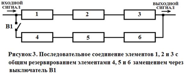 Предположим, что система состоит из 6 одинаковых по надежности элементов с вероятностью безотказной работы в течение времени t: Р1(t) = Р2(t) = Р3(t) = Р4(t) = Р5(t) = Р6(t) = 0,997. Вероятность безотказной работы системы определится, как: Рс(t) = 1 – {1 - РI(t) } · {1 - РII(t) }, где РI(t) = { Р (t) }3 = 0,9973 = 0,991027; РII(t) = { Р (t) }3 = 0,9973 = 0,991027. Тогда: Рс(t) = 1 – {1 - РI(t) } · {1 - РII(t) } = 1 – (1 – 0,991027) · (1 – 0,991027) = 1 – (0,008973)2 = 1 – 0,0000805 = 0,9999195. Таким образом, путем общего резервирования система, состоящая из элементов со сравнительно невысокой надежностью, превратилась в близкую к абсолютно надежной систему. Рассмотренная система называется системой с постоянным общим резервированием, поскольку резервные элементы соединены с основными элементами в течение всего времени работы. Это является недостатком, ведущим к излишнему расходу ресурса работы элементов. Для повышения экономичности расхода ресурса элементов применяются системы с резервированием замещением. В этом случае резервирование включается при отказе основной цепи элементов (рисунок 3).