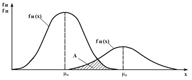 Рисунок 1. Графики плотности вероятности статистического распределения прочности объект fп(х) и плотности распределения нагрузок на объект fн(х): μн – математическое ожидание нагрузки; μп - математическое ожидание прочности. Для выполнения расчетов и определения вероятности отказов объект следует определить условия, при которых под кривыми fн(х) и fп(х) возникнет общая область А. Для этого необходимо описать функции fн(х) и fп(х). Для этих целей на практике рассматривают 5 наиболее распространенных случаев: 1. Функции плотности распределения нагрузки fн(х) и прочности fп(х) имеют экспоненциальное распределение. 2. Функции плотности распределения нагрузки fн(х) и прочности fп(х) имеют нормальное распределение Гаусса. 3. Функции плотности распределения нагрузки fн(х) и прочности fп(х) имеют гамма- распределение. 4. Функция плотности распределения нагрузки fн(х) имеет нормальное распределение Гаусса, а функция плотности распределения прочности fп(х) имеет распределение Вейбулла. 5. Функции плотности распределения нагрузки fн(х) и прочности fп(х) имеют распределение Вейбулла. Наиболее простым случаем является первый случай – когда функции плотности распределения нагрузки и прочности имеют экспоненциальное распределение. При этом вероятность отказа элемента определяется по формуле: Q = 1 – λн/(λн + λп), где λн и λп - параметры функций плотности распределений нагрузки и прочности. Наиболее общим и распространенным является второй случай – когда функции плотности распределения нагрузки и прочности имеют нормальное распределение Гаусса (рисунок 1). Как видно из графиков рисунка, надежность элемента определяется взаимным расположением кривых fн(х) и fп(х), а также величинами математического ожидания нагрузки μн и математического ожидания прочности μп. Отношение величины математического ожидания прочности μп к величине математического ожидания нагрузки μн называется коэффициентом запаса прочности КЗ: КЗ= μп / μн. Из рисунка 1 и выражения для определения КЗ следует, что чем больше коэффициент запаса прочности. Тем меньше вероятность отказа элемента из-за того, что нагрузки на него превысят прочность. Увеличивая величину КЗ мы сдвигаем функцию fп(х) вправо. При определенном значении КЗ ˃ ККРЗ кривые fн(х) и fп(х) не будут пересекаться (рисунок 2). В данном случае ККРЗ - это критическое значение коэффициента запаса прочности, обеспечивающее не пресечение кривых fн(х) и fп(х).