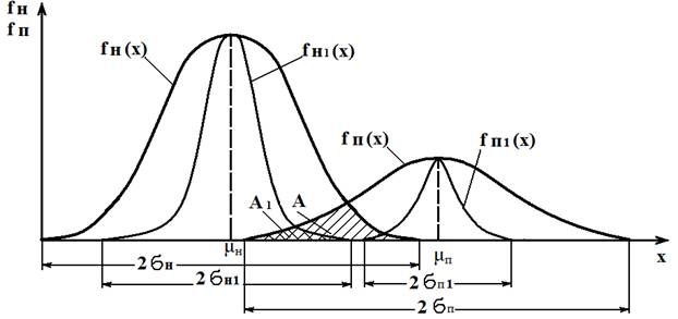 Рисунок 3. Расположение кривых fн(х) и fн1(х) относительно кривой fп(х): fн(х) – плотность распределения нагрузки при обычном рассеянии ϭн; и fн1(х) – плотность распределения нагрузки при уменьшенном рассеянии ϭн1 . Уменьшая параметр рассеяния плотности распределения нагрузки при тех же максимальных ее значениях, добиваются того, что область А1 пересечения кривых fн1(х) и fп(х) будет значительно меньше области А в случае пересечения кривых fн(х) и fп(х). В результате вероятность отказа объекта из-за превышения нагрузки над прочностью существенно снижается. Пример 1. На двух сходных анкерных участках установлен контактный провод МФ-100. Сила натяжения проводов у компенсаторов составляет 10 кН, что обеспечено установкой 10 грузов массой по 25 кг каждый. Коэффициент передачи компенсатора составляет 4:1. Провода выдерживали нагрузку от прохождения ПС массой 6 тыс. тонн при нормированном ветре и гололеде. Прошло время и провода подверглись износу. Их сечение уменьшилось. На одном анкерном участке провод эксплуатировался правильно и при достижении его износа 10 мм2 был снят один груз компенсатора. Натяжение уменьшилось до 9 кН. Провод продолжал выдерживать проход ПС массой 6 тыс. тонн при ветре и гололеде. На другом участке измерение и учет износа велись менее тщательно. При достижении износа 10 мм2 груз компенсатора своевременно снят не был. При проходе ПС массой 6 тыс. тонн в условиях ветра и гололеда провод не выдержал нагрузки и оборвался. Пример показывает важность соблюдения правил технической эксплуатации КС, что ведет к уменьшению вариации нагрузок, а следовательно и к повышению надежности. Применение современных технологий позволяет уменьшить погрешности при изготовлении элементов СЭЖТ. Коэффициент вариации плотности распределения прочности уменьшается. В этом случае говорят, что увеличивается равнопрочность объекта. На рис. 4 представлен случай повышения надежности объекта за счет одновременного снижения коэффициента вариации плотности распределения нагрузки νн и коэффициента вариации плотности распределения прочности νп.